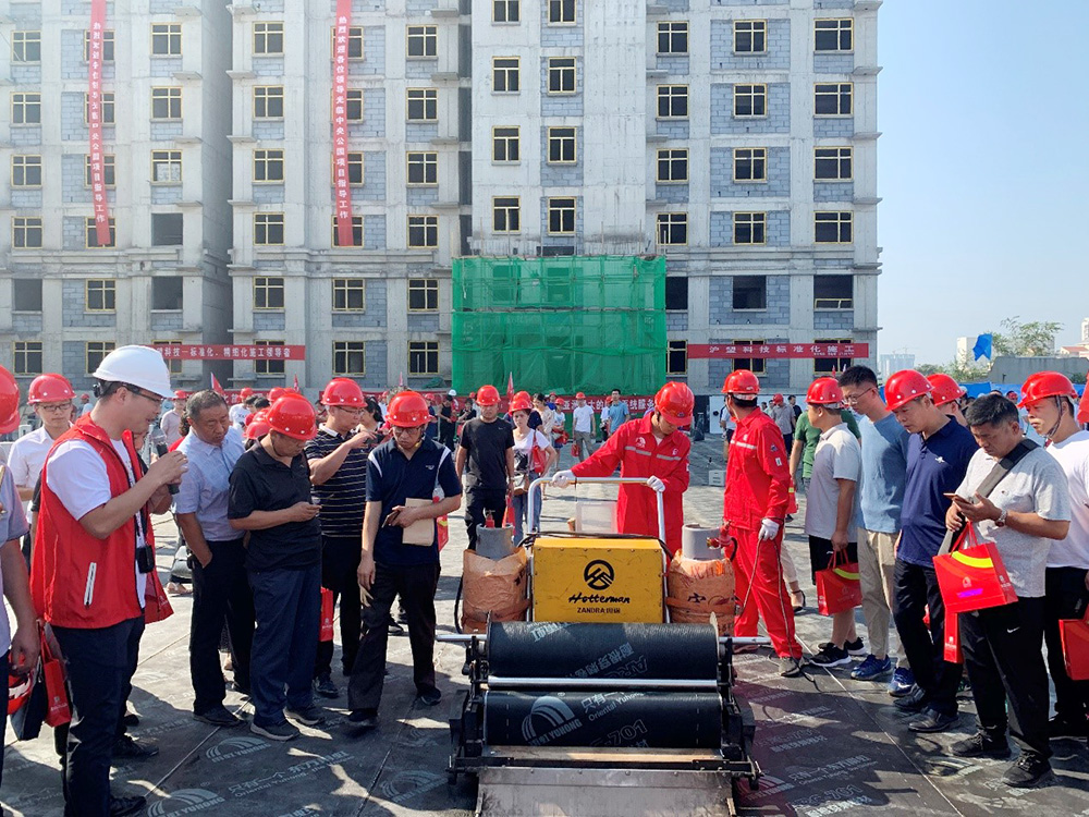 觀摩會現場,東方雨虹工建集團大鄭州區域總經理朱新峰表示,濮陽東方雨虹生產基地的建立,立足本地,輻射并滿足周邊區域的防水需求,全面踐行“為人類為社會創造持久安全的環境”使命;工建集團大鄭州區域技術副總工程師孫新磊向與會人員展示了東方雨虹各業務領域的高質量產品和標準化施工流程,現場操作“虹人”“騎行者”等機械化設備,闡述了新型材料的優勢和使用范圍。