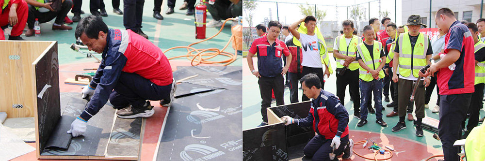 雨虹學(xué)院高級培訓(xùn)師張廣輝、2019“聯(lián)盟杯”全國建筑防水行業(yè)職業(yè)技能大賽-防水涂料項(xiàng)目冠軍洪存峰等為合伙人現(xiàn)場演示瀝青防水卷材、高分子防水卷材、防水涂料等產(chǎn)品的標(biāo)準(zhǔn)化施工工藝。