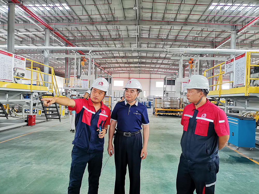 在東方雨虹廣州生產(chǎn)研發(fā)物流基地總經(jīng)理助理劉夢(mèng)龍的陪同下,李院長一行參觀了高分子卷材車間。