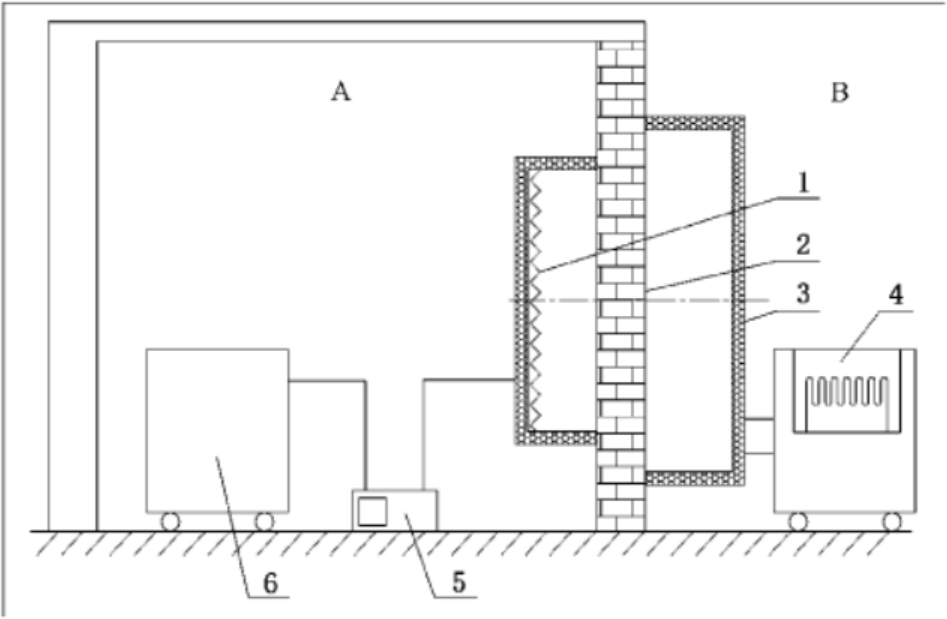 (1.計(jì)量熱箱;2.被測(cè)圍護(hù)結(jié)構(gòu);3.冷箱;4.制冷裝置;5.控制器;6.環(huán)境加熱器:A.室內(nèi);B.室外。)